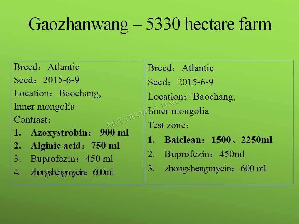 Location: Donggeliang Village, Baochang County, Inner Mongolia.Owner: Hejia AgriSoil: sand landTesting product: Baiclean, replace Azoxystrobin and imported seaweed fertilizer....view detail >>